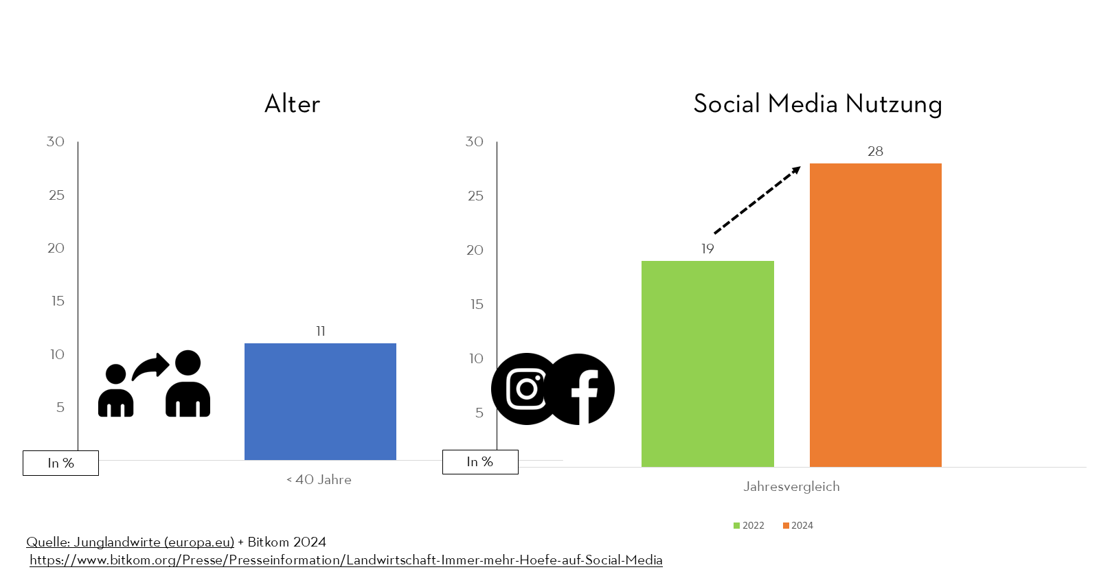 Laut einer repräsentativen Befragung von 500 landwirtschaftlichen Betrieben im Auftrag des Digitalverbands Bitkom sind 28 Prozent der Höfe in Deutschland auf sozialen Medien wie Instagram, Facebook aktiv. Obwohl nur 11 % der Landwirte in der EU unter 40 Jahre alt sind, zeigt die hohe Social Media-Nutzung, dass die Altersstruktur allein kein ausreichender Indikator für die Wahl der Kommunikationskanäle ist.