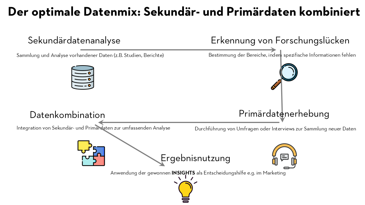 Eigene Darstellung: Durch die professionelle Kombination von Primär- und Sekundärdaten zu wertvollen Insights entstehen solide Entscheidungsgrundlagen.