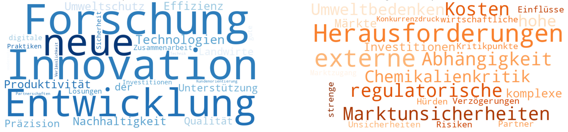 - Positive Aspekte: Begriffe wie Innovation, Forschung, Entwicklung, neue Technologien, Nachhaltigkeit, Umweltschutz, Produktivität, Effizienz, Unterstützung der Landwirte, Qualität, Präzision, Zusammenarbeit, digitale Lösungen, Investitionen, gute Praktiken, Sicherheit, Kundenorientierung, Partnerschaften, Verlässlichkeit und modernste Technik.
